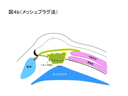鼠径部切開法という手術方法で、直接鼠径部を切開して治療する手術方法です。日本における鼠径ヘルニアの手術の約6~7割がこの方法で行われています。具体的には鼠径部のヘルニアで腫れている所の少し上を斜めに約4cm切開して手術を行います(図1)。ヘルニアへのアプローチとして,大きく分けて前方から到達する方法と後方(腹膜前腔)から到達する方法があります。前方からの到達法はヘルニアに前方から近づき、ヘルニア内容をおなかに押し戻してからヘルニアの出口に前からメッシュを挿入します(図2).一方,後方(腹膜前)からの到達法はヘルニアに後方から近づき、ヘルニア内容をおなかに引き戻してからヘルニアの出口の後ろにメッシュを敷いて閉鎖する方法です(図3)。図4に前方からの典型術式としてリヒテンシュタイン法、メッシュプラグ法術後のメッシュ位置(図4a,図4b)と後方(腹膜前)からの典型術式としてクーゲル法術後のメッシュ位置(図4c)を示します.