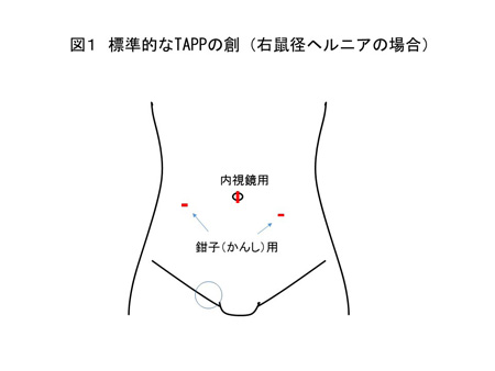 TAPP法は英語のTransabdominal preperitoneal approachの略で、腹腔鏡(スコープ)を臍または臍に近い位置から挿入し,2本の操作鉗子(かんし)を通常臍の下の左右に横に2カ所入れ内視鏡の画像を映し出したモニターを見ながら行なう手術です(図1)。